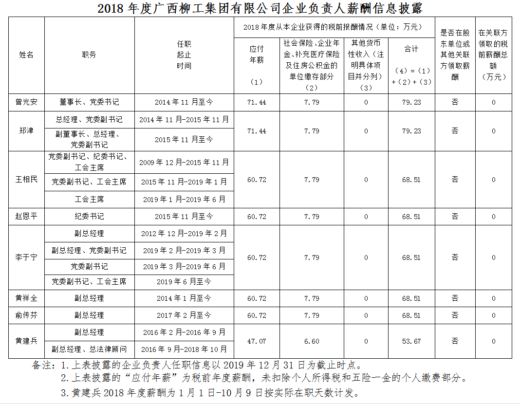 2018年度廣西柳工集團有限公司企業(yè)負責人薪酬信息披露