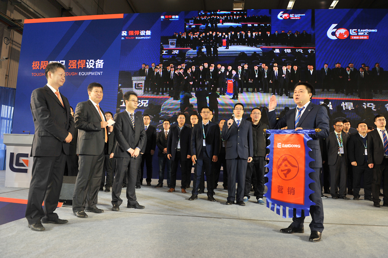活動現場舉行了軍令授旗儀式(如下圖)。柳工挖掘機、推土機的研發、采購、生產、營銷團隊分別接受領導下達的任務指令,并當場宣誓,保證完成任務!